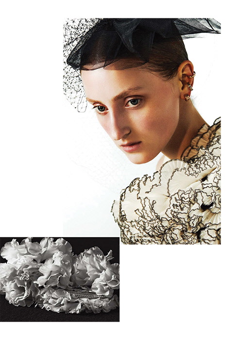함께 연출한 블랙 헤어피스와 화이트 레이스 장식 모두 에디터 소장품.
