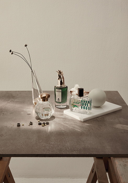 (왼쪽부터) 토카 줄리에타 토카(tocca)는 ‘터치(touch)’의 이탈리아어. 제품 하나하나에 주인공이 지닌 매력적인 스토리를 담았다. 여덟 가지 시리즈 중 토카 줄리에타는 영원히 끝나지 않는 아티스트와 뮤즈의 로맨틱한 관계를 연상시키는 온화하고 매력적인 향이다. 그린 애플, 핑크 튤립, 바닐라 오키드, 그리고 앰버 향을 매치해 달콤하며 시원하다. 50ml 9만9천원 펜할리곤스 헬렌 헬렌은 꽤 독립적인 여성이다. 중요하다 생각하는 것에 기꺼이 시간을 할애하고, 이루고자 하는 바를 분명하게 표현할 줄도 아는 당당한 여자. 이런 헬렌을 묘사하기 위해 투베로즈 향에 스파클링한 핑크 페퍼콘의 향기를 더했고, 만다린을 첨가했다. 여기에 재스민 향을 가미해 사파리에서 만난 재치 있는 남자 테디와 ‘썸’ 타는, 한층 달콤하고 매력적인 헬렌을 완성했다. 75ml 37만원. 프라고나르 상탈카다몸 향신료 카르다몸의 탄생지이자 동방의 풍요로운 대지에 세운 시암제국. 그곳의 이국적인 정원에서 낮 2시쯤 그늘진 나무 아래서 모처럼 여유를 즐기는 강인하고 카리스마 있는 귀족 여성을 떠올리게 하는 향이다. 그린 노트로 시작해 우디 노트로 강렬하게 마무리되는데, 샌들우드와 벤조인의 따스하고 섬세한 부드러움도 잔잔하게 깔려 있다. 50ml 8만3천원 문의 080-363-5454