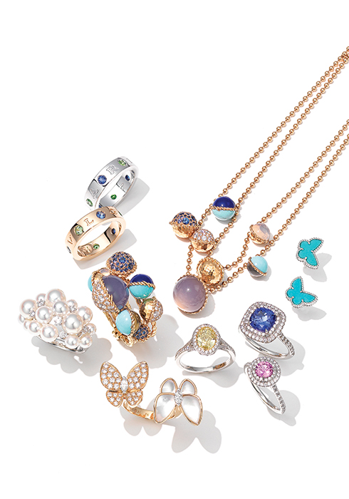 달콤한 셔벗 모양의 컬러풀한 디저트를 떠올리게 하는 파리 누벨바그 컬렉션 링과 네크리스. 각 5천만원대 모두 까르띠에. 선명한 블루 터쿼이즈로 나비 모티브를 형상화한 스위트 알함브라 이어링 3백60만원 반클리프 아펠. 희소가치가 높은 화려한 스톤을 세팅한 컬러 스톤 주얼리. 블루 탠저나이트 링 1천만원대, 핑크 사파이어 링 1천만원대, 옐로 다이아몬드를 세팅한 오벌 링 6천만원대 모두 티파니. 두 마리의 나비를 비대칭적으로 세팅한 투 버터플라이 머더오브펄 컬렉션 2천3백만원대 반클리프 아펠. 아코야 진주와 다이아몬드를 포도송이처럼 세팅한 링 3백만원대 타사키. 정교한 젬스톤을 달콤한 디저트처럼 세팅한 불가리 불가리 로만 소르베 링 각 3백만원대 모두 불가리.
