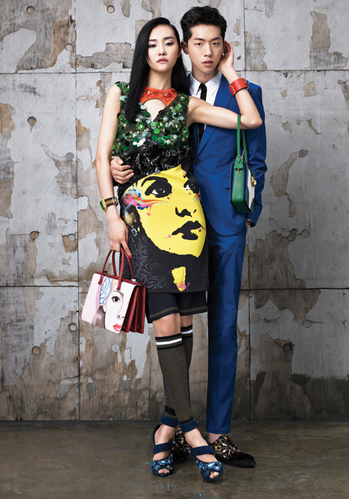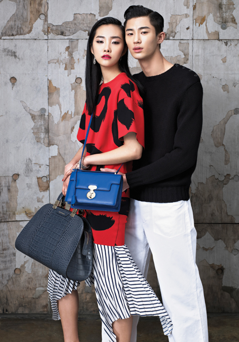 (여) 아티스틱 프린트 레드 톱, 스트라이프 스커트 모두 가격미정 모두 셀린느. 블루 크로스 백, 그레이 토트백 1백 97만원 모두 엠포리오 아르마니. 이어링 1백36만원 저스틴 데이비스. 개츠비 레이어드 브래이슬릿 53만원 미네타니. |