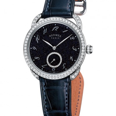 에르메스는 2015 바젤 월드에서 아쏘 에퀴예르 시계에 특별함을 더한 ‘아쏘 에퀴예르 어벤츄린’을 소개했다. 별이 빛나는 밤하늘을 보는 듯한 느낌을 주는 어벤츄린 다이얼의 6시 방향에 자리 잡은 스몰 세컨즈는 28개의 다이아몬드로 둘러싸여 화려함을 뽐낸다. 뿐만 아니라 다이얼을 감싸는 화이트 골드 케이스 역시 총 74개의 다이아몬드를 세팅해 우아하게 빛나며, 인디고 블루 컬러의 악어가죽 스트랩으로 고급스러움을 더했다. 특히 에르메스를 상징하는 H자 패턴을 넣은, 무브먼트의 받침이 되는 메인 플레이트가 돋보인다. 계속 읽기