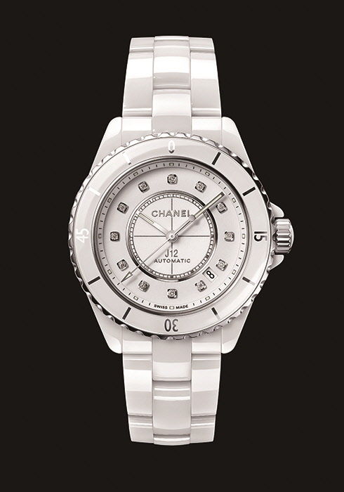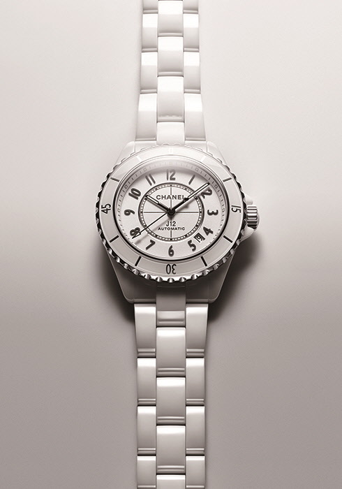 샤넬의 아티스틱 디렉터 자크 엘뤼가 고안한 J12는 국제 요트 대회 아메리카스컵의 12m급 J 클래스 레이스에 참가한 요트의 실루엣에서 영감을 얻은 것으로, 모델명 역시 여기에서 따왔다. 타임리스하고 스포티한 디자인의 올 하이테크 세라믹 워치는 2000년 블랙 컬러로 처음 선보인 이래 2003년 화이트 버전으로 출시, 이후 세월의 흐름에 따라 다양한 컴플리케이션과 디자인을 선보이며 크게 사랑받았다. 올해 출시 20주년을 기념해 선보인 뉴 J12 컬렉션은 새로운 셀프 와인딩 무브먼트를 탑재한 것이 특징. 투명한 크리스털 케이스 백을 통해 확인할 수 있는 칼리버 12.1은 스위스 시계 제작업체인 케니시(KENISSI) 매뉴팩처에서 개발한 것으로, 오실레이팅 웨이트를 디자인한 샤넬의 크리에이션 스튜디오와 긴밀한 협업을 거쳤다. 한편 미세하지만 더욱 정교하게 다듬어 완벽에 가까워진 디자인 역시 눈에 띈다. 베젤을 키우고 다이얼의 숫자와 인덱스 폰트를 조정해 가독성을 높였고, ‘스위스 메이드’ 문구 위치를 플랜지로 내려 정돈된 느낌이 든다. 또 카보숑 컷 세라믹으로 장식한 크라운을 3분의 1 크기로 줄여 크라운 가드와 부드럽게 이어지도록 했다. 케이스는 이전보다 약간 두껍게 조정했지만, 시계 측면 라인을 안으로 더욱 둥글린 덕분에 큰 차이는 느껴지지 않는다. 컬렉션을 구성하는 모든 모델의 케이스는 지름 38mm 사이즈로 화이트, 블랙 세라믹 기본 모델을 비롯해 다이아몬드 인덱스 버전, 올 블랙(누아르), 올 화이트(팬텀) 에디션, 다이아몬드를 풀 파베 세팅한 유니크 피스와 리미티드 에디션 등 다채로운 라인업으로 전개한다.