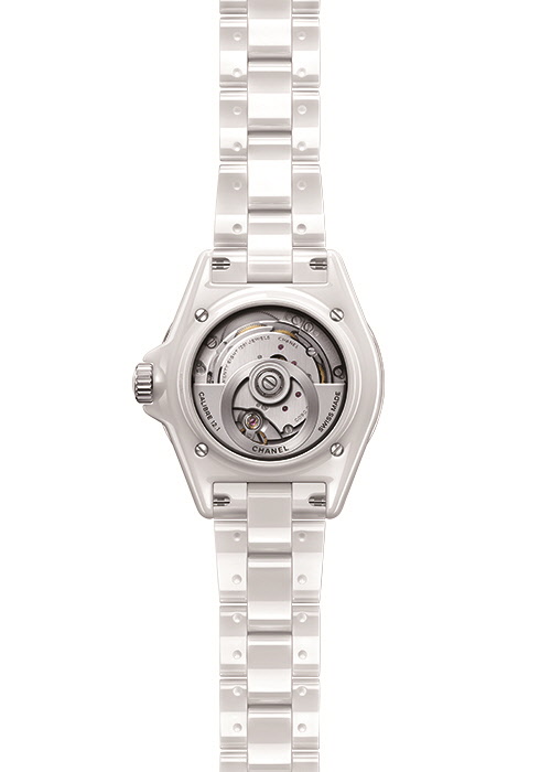 1(1,2), 2 숫자 인덱스 다이얼을 더한 화이트 세라믹 케이스 버전 J12(H5700). 사파이어 케이스 백을 통해 칼리버 12.1의 정교한 자태를 확인할 수 있다.