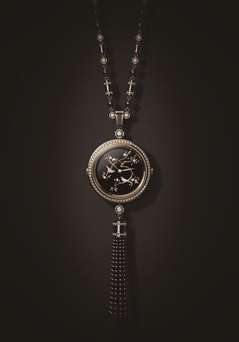 가브리엘 샤넬이 늘 옆에 두고 함께했던 물건과 상징을 담아 완성하는 창의적인 컬렉션. 에나멜 가공부터 인그레이빙, 보석 세공에 이르기까지 각 분야에서 우수한 장인의 손길을 거치기에 공방의 노하우와 탁월한 기술력은 물론 파인 워치메이킹의 정수까지 엿볼 수 있다. 올해는 처음으로 샤넬 워치 크리에이션 스튜디오에서 마드모아젤 프리베 소투아르 모델을 선보였다. 샤넬 여사의 아파트를 장식한 코로만델 병풍의 시적인 아름다움을 담은 유니크 피스로 베이지 골드 케이스와 오닉스 다이얼로 이뤄진 펜던트 시계에 꽃, 나무, 새의 모습을 담았다.