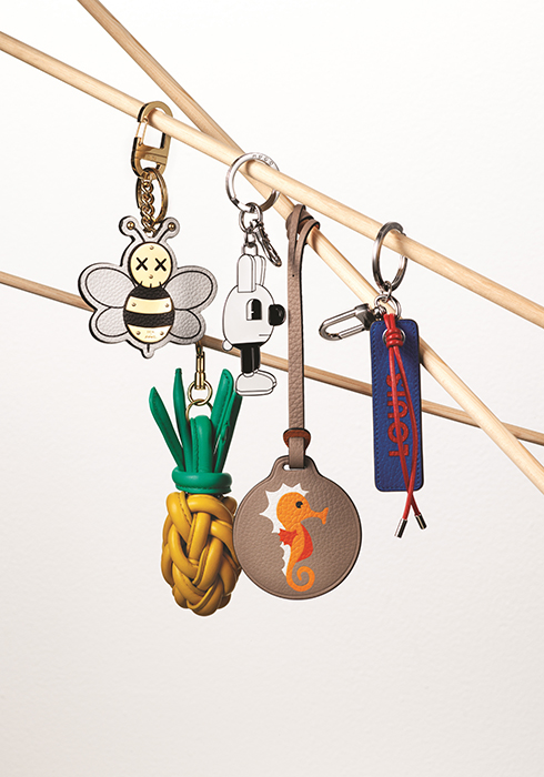 (왼쪽부터) 키 링 또는 백 참으로 연출 가능한 꿀벌 모티브 액세서리 가격 미정 디올 맨. 부드러운 카프 레더를 꼬아 만든 파인애플 모양 참 35만원 안야 힌드마치. 에나멜로 선명한 컬러를 입힌 토끼 모양 키 링 13만5천원 보스 맨. 정교한 마키트리 기법으로 해마 무늬를 완성한 마카롱 서머 백 참 가격 미정 모이나. 양면에 하우스를 상징하는 로고를 프린트한 가죽 소재 ‘탭 루이 비통 백 참 & 키 홀더’ 44만원 루이 비통.