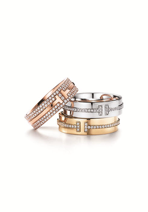 마키즈 컷 다이아몬드를 세팅해 꽃잎을 형상화한 빅토리아 키 펜던트 티파니.  다이아몬드와 다양한 컬러의 골드가 시크한 아름다움을 선보이는 Tiffany T Two 링 모두 티파니.