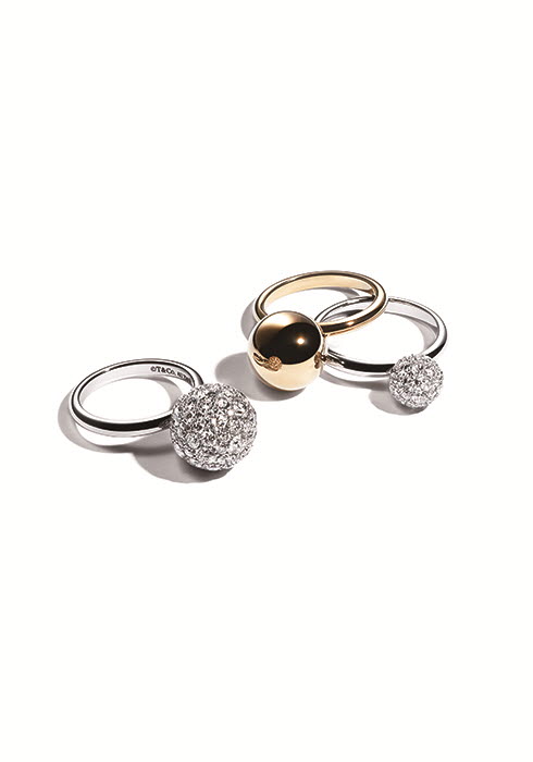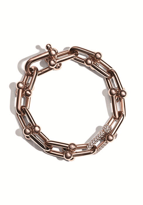 체인 링크와 다이아몬드가 어우러져 독창적인 디자인을 완성한 티파니 하드웨어 라지 링크 브레이슬릿. 18K 로즈 골드 소재다. 티파니.  다양한 사이즈의 볼과 다이아몬드를 세팅한 디자인으로 레이어링의 미학을 느낄 수 있는 티파니 하드웨어 볼 링 모두 티파니.