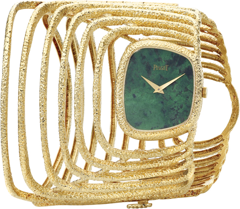 5 신비로운 빛을 발하는 하드 스톤 다이얼과 옐로 골드의 독특한 텍스처로 완성된 아방가르드한 커프 워치. 1980년대.