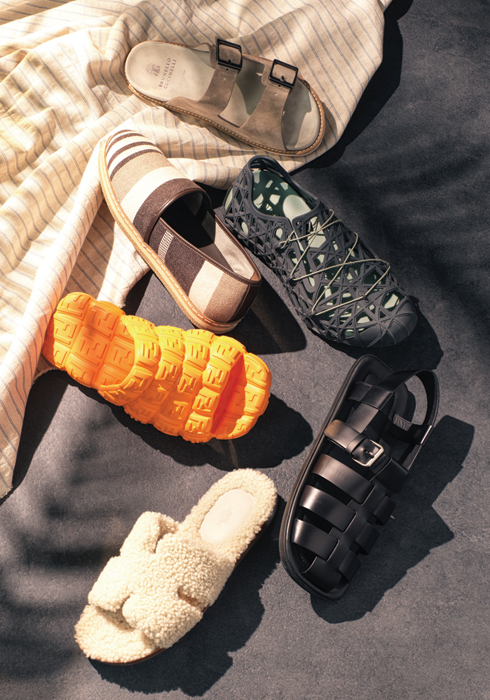 가벼운 마이크로 원사로 제작한 가죽 밑창과 부드러운 워시드 스웨이드 소재로 시원한 착용감을 선사하는 스웨이드 어반 슬라이드 90만원대 브루넬로 쿠치넬리. 문의 02-3479-1804.