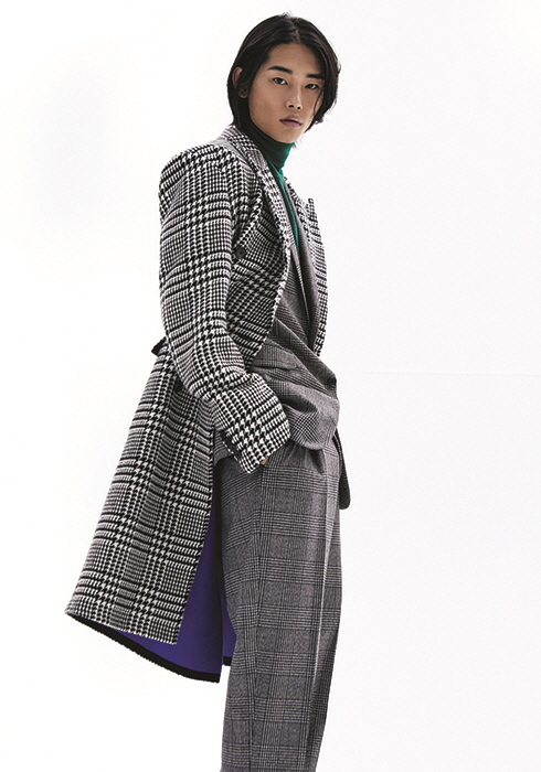 헐렁한 배기 수트의 스타일리시한 매력. 체크 코트 5백20만원, 재킷 가격 미정, 팬츠 1백48만원, 그린 터틀넥 풀오버 1백33만원 모두 벨루티.