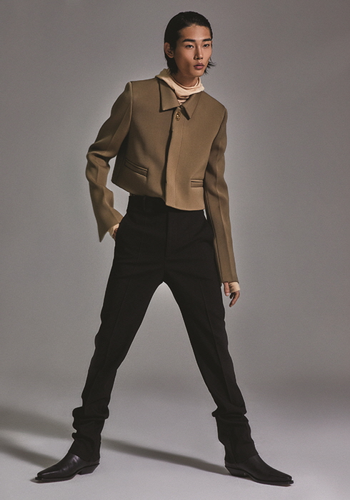 쇼트 재킷으로 유니크한 스타일을 완성했다. 브라운 블루종 가격 미정, 베이지 후드 톱 1백60만원, 블랙 팬츠 가격 미정, 블랙 부츠 1백58만5천원 모두 보테가 베네타.