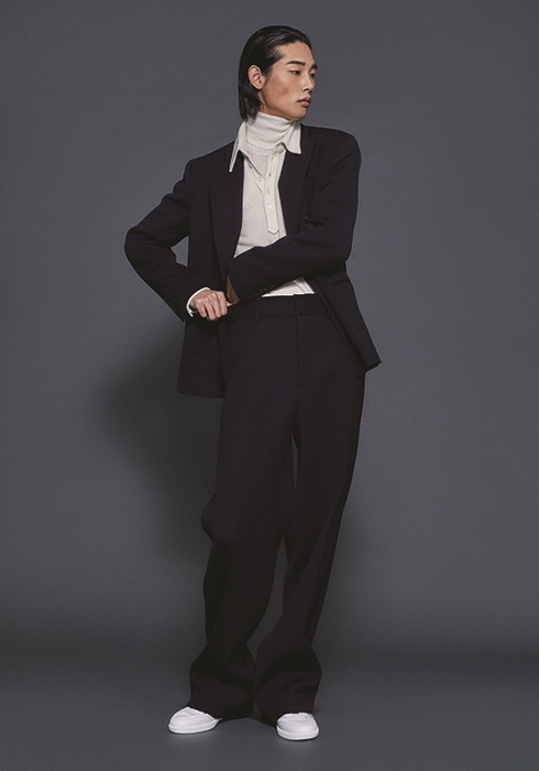 블랙 앤 화이트 수트의 캐주얼한 변신. 네이비 더블 재킷 2백만5천원, 화이트 저지 셔츠 64만5천원, 터틀넥 풀오버 1백7만5천원, 네이비 팬츠 1백13만5천원, 화이트 스니커즈 가격 미정 모두 토즈.