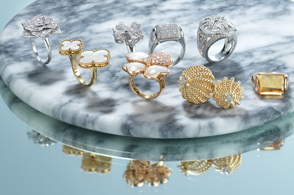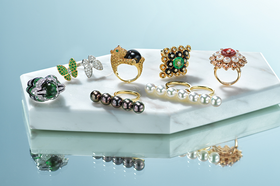 그린 컬러의 투르말린을 중심으로 양쪽에 위용을 상징하는 독수리 모티브를 세팅한 칭하 링. 다이아몬드와 라운드 바게트 컷 차보라이트를 세팅했다. 8천만원대 부쉐론. 화이트 골드와 옐로 골드에 차보라이트와 다이아몬드를 섬세하게 세팅한 한 쌍의 나비 모티브 투 버터플라이 차보라이트 컬렉션 링 2천9백만원대 반클리프 아펠. 사랑스러운 아기 사자가 카보숑 컷 투르말린을 안고 있는 디자인의 쉬블리 링. 사자의 눈은 에메랄드로 장식했다. 6천만원대 부쉐론. 유니크한 원형 디자인이 돋보이는 제품으로 옐로 골드, 깊은 블랙 컬러의 오닉스와 신비로운 그린 컬러의 크리소프레이즈가 조화를 이루는 부통 도르 크리소프레이즈 링 2천6백만원대, 같은 컬렉션으로 핑크 골드, 우아한 자개, 강렬한 레드 컬러의 커닐리언을 세팅한 부통 도르 커닐리언 링 2천4백만원대 모두 반클리프 아펠. 직선 기둥 위에 진주가 떠 있는 것처럼 디자인한 밸런스 링 2개를 합쳐놓은 듯 유니크한 디자인의 밸런스 룩스 링 5백50만원대, 고혹적이고 우아한 블랙 컬러의 9mm 최상급 남양 흑진주를 직선 바에 나란히 세팅한 모던한 디자인이 특징인 밸런스 시그너처 옐로 골드 링 4백30만원대 모두 타사키. |