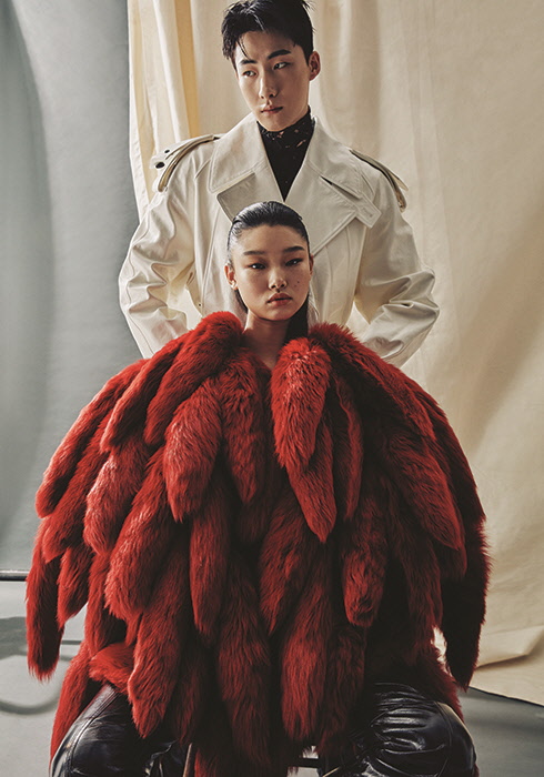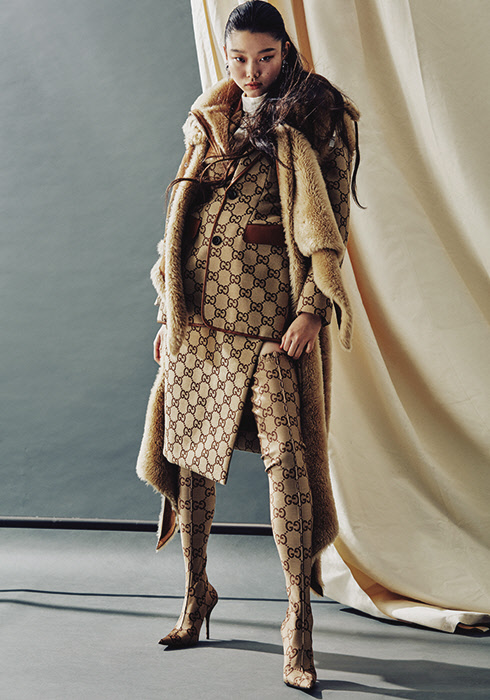 슬리브리스 시어링 재킷 1천2백96만5천원 지방시. 브라운 컬러 로고 재킷 7백10만원, 화이트 컬러 셔츠 1백61만원, 브라운 컬러 로고 스커트 6백33만원, 브라운 컬러 로고 판타 슈즈 6백30만원 모두 구찌. |