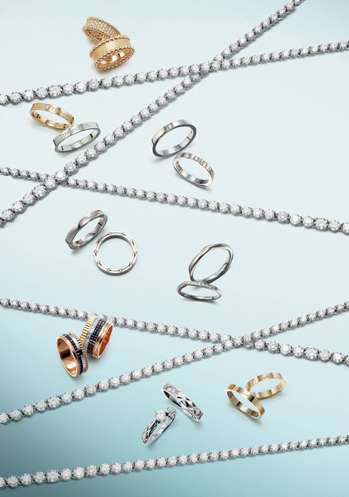 브릴리언트 컷 다이아몬드와 프린세스 컷 다이아몬드를 세 줄로 세팅한 화려한 웨딩 밴드 링 3천4백만원대, D컬러 VVS2 등급 3.03캐럿에 달하는 하이 주얼리 디안 링 가격 미정 모두 까르띠에.