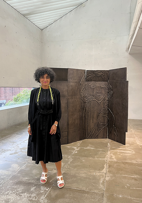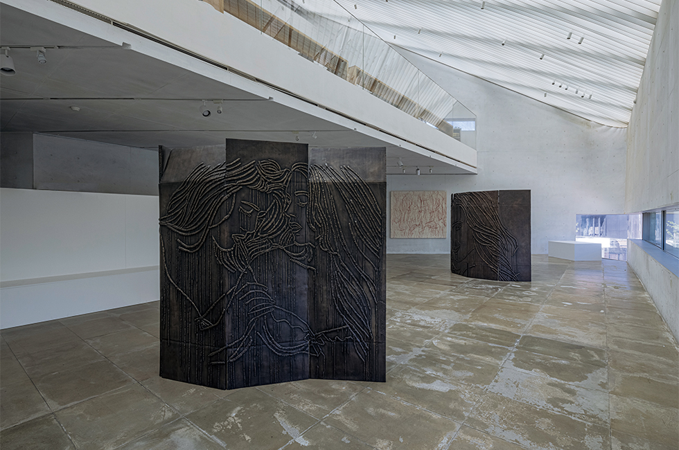 이번 프리즈·키아프 서울 주간에 티나킴 갤러리가 송원아트센터에서 공개한 가다 아메르의 전시명은 <Paravent Girls / 파라벤트 걸>(8월 30일~9월 15일). 그녀와 뉴욕에서 오랜 호흡으로 창조적 협업을 해온 티나킴 갤러리는 앤드루 크랩스 갤러리, 보르톨라미 갤러리와 함께 개최하는 뉴욕 화랑들의 협력전 <The Cumulative Effect / 누적효과>와 더불어 아메르의 개인전도 준비했다. ‘paravent’라는 단어 뜻대로 스크린(병풍)의 형태를 한 커다란 청동 조각 작업을 선보인 전시다. 수많은 제작소가 문을 닫게 만든 팬데믹 사태를 계기로 티나킴 갤러리를 통해 소개받은 한국의 주물공장에서 완성된 작품 시리즈라고. 여성 인물들이 새겨진 조각 작품의 원본은 사실 길거리에서 흔히 접할 수 있는 종이 박스다. 물건을 옮기는 박스 위에 작가는 붓 대신 무른 점토를 사용해 이 여성들을 그려 넣었다고 한다. 박스의 면면을 잇는 절개선이 있는 부분을 펼치면 마치 병풍처럼 세워놓을 수 있다. 긴 머리를 휘날리는 여성들의 안식처가 되는 셈이다. “형상과 배경, 회화와 조각이라는 전통적 위계는 사라지고, 이름 없는 씨앗이 땅에 내려앉아 자라는 정원의 섭리와 같이 껍데기만 남은 박스는 인물을 담아내는 주소가 되고, 여성의 이미지는 날아다니는 박스의 거주자가 된다”는 큐레이터의 설명이 와닿는다. 존재감이 남다른 이 청동 스크린 시리즈는 오는 12월 프랑스 남부 도시 마르세유에 있는 국립 미술관 Mucem에서 열릴 그녀의 개인전에도 전시될 예정이라고. 아픈 기억도, 즐거운 추억도 많은 그녀의 고향 같은 도시 니스와 가까운 ‘이웃’ 도시인 마르세유를 상징하는 국립 미술관에서의 전시라니, 무척 특별한 의미로 다가올 수밖에 없을 터. 정말 기쁘고 뜻깊다고 몇 번이나 강조하는 가다 아메르는 안 그래도 “프리즈 서울 개막을 보고는 전시 준비차 마르세유로 향할 예정”이라고 눈빛을 반짝였다.
