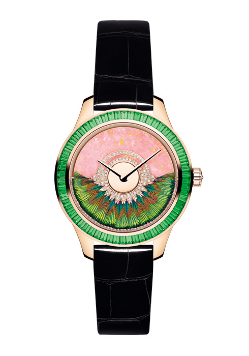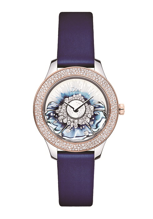 메종의 첫 번째 오트 쿠튀르 드레스 중 하나인 ‘미스 디올’과 무슈 디올을 기념하는 모델. 염료로 물을 들인 것처럼 자연스러운 색을 입힌 다이얼 위에 입체적인 꽃잎 모양의 골드 로터를 장식했다. 오픈워크 처리하고 투명한 세라믹 소재를 더한 로터에는 라운드 컷 다이아몬드를 산발적으로 세팅해 360도 회전하며 광채를 발한다. 다이얼과 베젤 소재를 달리한 스틸 케이스의 블루, 그린, 레드 버전으로 선보이며 88개 리미티드 에디션이다.