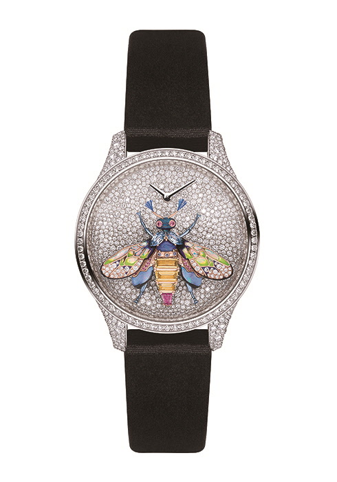 무슈 디올이 사랑한 정원에 사는 작은 생명체인 꿀벌을 모티브로 한 컬렉션으로, 14가지 버전의 유니크 피스로 구성했다. 다이얼 중앙을 장식한 꿀벌은 투르말린, 사파이어, 루비, 애미시스트, 차보라이트, 가닛, 오팔, 토파즈 등 다채로운 컬러의 주얼리와 새의 깃털로 장식해 마치 금방이라도 날아오를 듯 생동감이 넘친다. 실제로 시계를 가볍게 흔들면 날갯짓을 하는 듯 미세하게 진동하는데, 이 또한 하우스의 정교한 기술력과 노하우가 느껴지는 부분. 크고 작은 라운드 컷 다이아몬드를 스노 세팅해 극도로 화려한 지름 36mm의 화이트 골드 케이스를 장착했으며 쿼츠 무브먼트로 구동한다. |