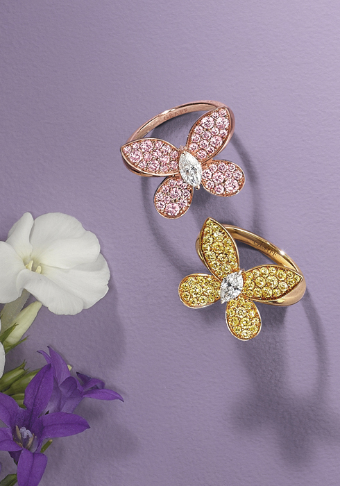 3 옐로 다이아몬드에 옐로 골드, 핑크 다이아몬드에 핑크 골드를 매치한 ‘버터플라이’ 컬렉션 반지.