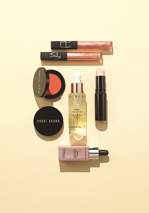 (위부터 시계 방향으로) ‘나스 글로스 모먼트 멀티 유즈 글로스’ 입술, 눈, 볼에 단독으로 바르거나 메이크업 위에 덧바르면 어느 각도에서나 글래머러스하게 빛나는 효과를 연출할 수 있는 제품. 비타민 E와 코코넛 오일을 함유해 피부를 보호하고 수분을 공급한다. 위부터 각각 #릴렌트리스, #리뎀션(5.2ml 3만6천원). ‘샤넬 바움 에쌍씨엘 트랜스페어런트’ 부드럽고 자연스러운 윤곽을 연출해 얼굴에 생기를 되살려주는 글로 스틱. 메이크업 마무리 단계에서 하이라이터로 눈꺼풀, 눈썹 뼈, 양 볼에 부드럽게 발라 광채를 더하거나, 투명한 컬러 표현을 위해 크림 블러셔를 바르기 전 블러셔 베이스 용도로 사용해도 좋다(8g 5만9천원). ‘지방시 땡 꾸뛰르 래디언트 드롭’ 촉촉한 마무리감을 자랑하는 일루미네이팅 베이스. 미세한 펄 입자를 포함한 가벼운 텍스처로 베이스 단계에서 크림 또는 파운데이션과 섞어 사용하면 얼굴 전체에 자연스러운 광이 감돈다. 혹은 베이스 메이크업을 마친 뒤 윤곽을 강조하고 싶은 부위에 내장된 브러시를 사용해 톡톡 찍어내듯 발라주면 하이라이터 같은 역할을 한다(15g 6만1천원). ‘샹테카이 로즈 드 메이 페이스 오일’ 프랑스 남부 그라스 지방에서 자라는 5월의 장미를 주성분으로 오직 자연에서 유래한 성분만 담은 제품. 피부에 풍부한 비타민 C를 공급하며 강력한 안티에이징 및 피부 재생 효과를 발휘한다. 세럼, 크림과 블렌딩하거나 마스크 팩을 붙일 때 사용하면 기초 케어의 효과를 배가하며 메이크업 제품에 섞어 연출하면 좀 더 촉촉하고 자연스러운 피부를 연출할 수 있다(30ml 27만5천원). ‘바비 브라운 팟 루즈 포 립스 앤 칙스’ 립과 치크에 모두 사용할 수 있는 크림 제형의 멀티 제품. 중간 정도 톤으로 투명하고 자연스럽게 발색되어 여러 번 덧발라도 어색하지 않다. 거울을 내장한 콤팩트한 패키지로 휴대와 사용이 간편한 것 또한 장점. 커버가 반쯤 열려 있는 제품의 컬러는 #칼립소 코랄(3.7g 4만4천원대).