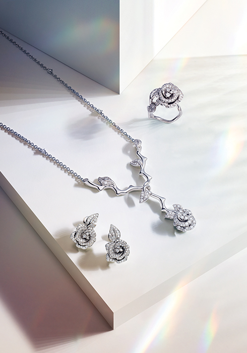 장미에서 영감받은, 화이트 골드 소재에 1캐럿 다이아몬드를 파베 세팅한 로즈 디올 바가텔 링, 화이트 골드로 섬세하게 디자인한 장미와 꽃잎 모양에 1.77캐럿 다이아몬드를 파베 세팅해 우아함을 더한 로즈 디올 바가텔 네크리스, 화이트 골드 소재에 1.13캐럿 다이아몬드를 파베 세팅한 로즈 디올 바가텔 이어링 모두 가격 미정 디올 파인 주얼리 02-3280-0104.