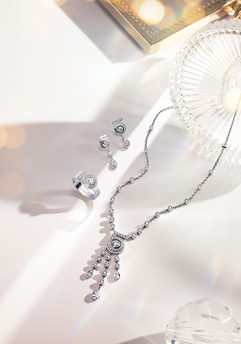 브랜드 시그너처인 숫자 5를 모티브로 한 18K 화이트 골드 소재에 31개의 라운드 컷 다이아몬드 0.67캐럿을 세팅한 이터널 N°5 이어링 1천7백30만원, 18K 화이트 골드 소재에 0.4캐럿의 브릴리언트 컷 다이아몬드 센터 스톤 1개와 0.41캐럿의 페어 컷 다이아몬드 센터 스톤 1개, 49개의 브릴리언트 컷 다이아몬드 총 2.01캐럿을 세팅한 드롭 스타일의 이터널 N°5 네크리스 6천8백80만원, 상징적 숫자 5를 표현한, 화이트 골드 밴드에 0.25캐럿의 브릴리언트 컷 다이아몬드 센터 스톤 1개와 19개의 브릴리언트 컷 다이아몬드 총 0.2캐럿을 세팅한 이터널 N°5 링 1천3백80만원 모두 샤넬 화인 주얼리 080-805-9628.