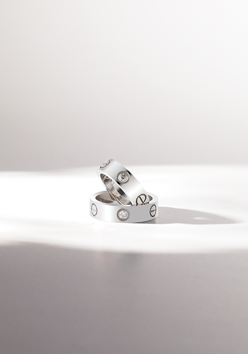 볼드한 디자인으로 강렬한 인상을 주는 2개의 원과 1개의 무빙 다이아몬드로 이뤄진 해피 스피릿 링 9백16만원 쇼파드 02-6905-3390. 2개의 정교한 플래티넘 브러시가 엇갈리며 사랑을 상징하는 눈부신 파베 세팅 다이아몬드의 인콘트로 다모레 링과 가드 링 가격 미정 불가리 02-2056-0170. 아름다운 사랑을 전하는 이브 피아제의 장미에서 영감받아 18K 화이트 골드에 98개의 브릴리언트 컷 다이아몬드 1.41캐럿을 파베 세팅해 활짝 핀 한 송이의 꽃을 그대로 재현한 로즈 링 1천7백만원대 피아제 1668-1874. 플라워 모티브의 디자인에 라운드 다이아몬드 총 2.19캐럿을 촘촘하게 세팅한 화이트 골드 세팅 링 2천7백33만원 그라프 02-2256-6810. 화이트 골드 소재에 0.77캐럿의 브릴리언트 컷 화이트 다이아몬드를 파베 세팅한 조세핀 아그레뜨 링 1천만원대 쇼메 02-3442-3359. 플래티넘 소재에 2캐럿 다이아몬드를 모던하게 세팅한 세팅 웨딩 링과 플래티넘 소재의 하모니 밴드 링 가격 미정 티파니 02-6250-8620.