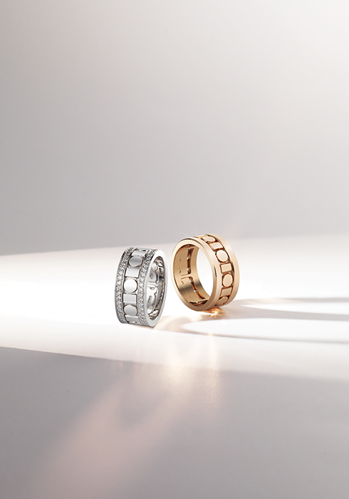 곡선미를 살린 모던한 스타일의 18K 로즈 골드 소재 밴드에 총 1.1캐럿의 38개 다이아몬드를 파베 세팅한 이코니카 링, 로즈 골드 밴드 위에 각기 다른 사이즈의 총 0.7캐럿, 34개 다이아몬드를 섬세하게 세팅한 스퀘어 형태의 모티브를 매치해 화려한 반짝임을 부여한 사비아 링 모두 가격 미정 포멜라토 02-3143-9486. 18K 베이지 골드로 퀼팅 모티브를 모던하고 심플하게 표현한 코코 크러쉬 브레이슬릿 1천2백50만원 샤넬 화인 주얼리 080-805-9628. 18K 로듐 플레이트 화이트 골드 소재의 밴드에 64개의 총 1.3캐럿 다이아몬드와 4.1캐럿 화이트 토파즈 1개, 6.5캐럿 화이트 토파즈 1개를 세팅한 누도 브레이슬릿 가격 미정 포멜라토 02-3143-9486. ‘T’ 자를 모티브로 한 18K 화이트 골드 밴드에 라운드 브릴리언트 컷 다이아몬드를 파베 세팅한 볼륨감 있는 스타일의 티파니 T1 와이드 풀 다이아몬드 힌지드 뱅글 가격 미정 티파니 02-6250-8620. 심플한 화이트 골드 밴드에 섬세한 비즈 장식과 다이아몬드로 눈부신 광채를 부여한 뻬를리 다이아몬드 브레이슬릿 3천3백만원대 반클리프 아펠 1877-4128. 18K 화이트 골드 밴드 양 끝에 자유롭게 회전하는 모티브를 더하고 30개의 브릴리언트 컷 다이아몬드를 매치한 오픈 뱅글 브레이슬릿 9백만원대 피아제 1668-1874. 브랜드의 상징적 표식인 네 잎 클로버를 그대로 재현한 기요셰 화이트 골드에 섬세한 비즈 장식과 다이아몬드를 더한 빈티지 알함브라 링 5백만원대, 브랜드 시그너처 장식인 클로버에 다이아몬드를 세팅하고 밴드 라인에 섬세한 비즈로 경쾌한 무드를 더한 뻬를리 스위트 클로버 링 1천만원대 모두 반클리프 아펠 1877-4128.