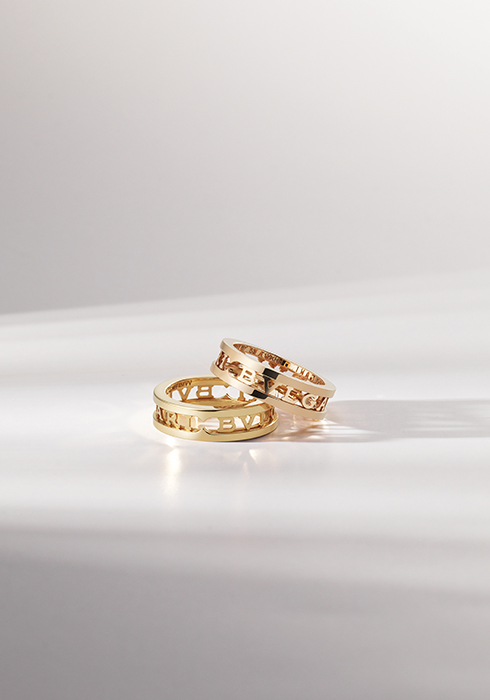 브랜드 대표 아이콘이자 베스트셀러인 커플 밴드로 더블 로고 장식과 나선 모티브가 특징이며, 모던하면서도 기하학적이고 건축학적인 디자인이 돋보이는 로즈 골드 소재의 비제로원 밴드 링 2백40만원대 불가리 02-2056-0170.