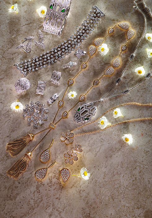 동물과 식물 모티브를 정교하게 세공한 까르띠에 파우나 앤 플로라 링 4천8백만원대. 반지 아래쪽에 놓인 꽃 모양 브로치는 플래티넘에 총 3.68캐럿의 다이아몬드를 세팅한 까르띠에 파우나 앤 플로라 브로치 9천4백만원대.입체적인 부채 모양 실루엣이 아름다운 불가리 디바스 드림 링 가격 미정. 뱀의 비늘을 정교한 세공과 다이아몬드 세팅으로 표현한 불가리 세르펜티 아이즈 온미 링 가격 미정. 화이트 골드에 T 로고를 다이아몬드로 형태화한 티파니 티파니 T 투 링 1천만원대. 1.5캐럿 다이아몬드를 볼륨감 있게 세팅한 타사키 바운드 인게이지먼트 웨딩 링 6천8백만원대. 귀여운 별 모티브의 타사키 코멧 다이아몬드 링 8백만원대. 뱀의 머리에서 영감을 얻은 부쉐론 쎄뻥 컬렉션 네크리스와 이어링, 링을 모았다. 네크리스 끝에 태슬이 달린 보헴 옐로 골드 폼폰 네크리스는 옐로 골드에 4백 개가 넘는 다이아몬드를 세팅해 극적인 느낌을 준다. 가격 미정. 브랜드 고유의 금 세공 기법과 다이아몬드 세팅 기법을 보여주는 쎄뻥 보헴 옐로 골드 드랍 이어링 4천만원대. 뱀의 비늘까지 세밀하게 표현한 쎄뻥 보헴 옐로 골드 원헤드 라지 링 3천만원대. 불가리 세르펜티 아이즈 온미 네크리스. 뱀의 눈을 표현한 그린 컬러 유색석은 에메랄드다. 가격 미정. 사랑스러운 꽃송이에 다이아몬드로 화려함을 불어넣은 반클리프 아펠 프리볼 컬렉션 링과 네크리스. 네크리스 1천5백만원대, 비트윈 더 핑거 링 2천5백만원대.