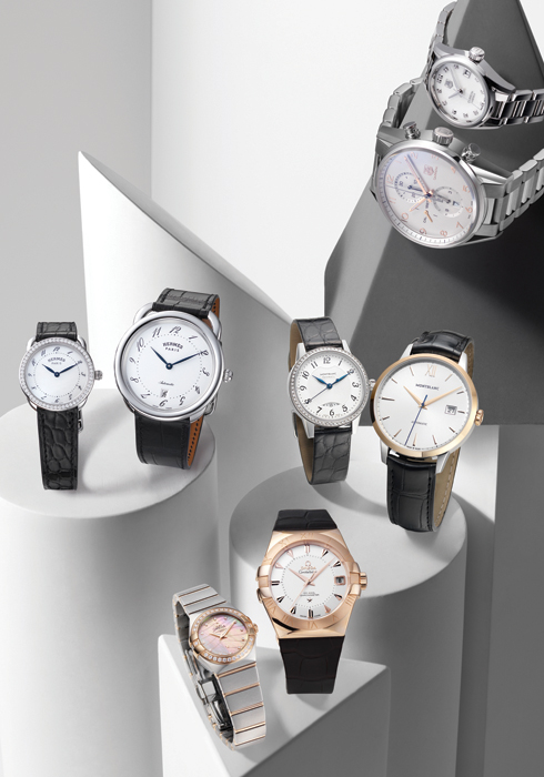 Best Couple Watches(왼쪽부터 시계 방향으로) 에르메스 아쏘 컬렉션 말안장 손잡이를 연상케 하는 시그너처 원형 케이스가 돋보이는 클래식한 워치. 오토매틱 무브먼트를 탑재한 41mm의 남성 스틸 워치는 매트한 질감의 블랙 악어가죽 스트랩으로 모던하면서도 강렬함을 표현했다. 쿼츠 무브먼트를 탑재해 가벼운 28mm 여성 스틸 워치는 화이트 자개 다이얼과 다이아몬드 세팅, 부드러운 블랙 악어가죽 스트랩을 더했다. 남성 워치 5백만원대, 여성 워치 1천만원대. 태그호이어 까레라 페어 워치 심플하면서도 클래식한 뉴 까레라 레이디, 남성을 위한 까레라 칼리버 1887 크로노그래프 워치는 클래식하면서도 현대적인 다이얼에 골드 핸즈를 매치했다. 합리적인 가격대가 매력적이다. 여성 워치 4백10만원, 남성 워치 7백77만원. 몽블랑 보헴 스틸 다이아 & 헤리티지 데이트 오토매틱 브랜드 가치 대비 가장 매력적인 가격으로 선보이는 몽블랑은 웨딩 워치 일순위에 꼽히는 브랜드다. 스틸 소재의 보헴 여성 컬렉션은 다이아몬드를 세팅한 버전임에도 1천만원 미만의 가격대로 경쟁력이 높다. 심플한 디자인의 남성 헤리티지 컬렉션 역시 클래식한 매력으로 어떤 남성에게나 잘 어울리는 디자인이다. 여성 워치 6백46만원, 남성 워치 5백75만원. 오메가 컨스텔레이션 세드나 & 플루마 오메가를 대표하는 워치이자 베스트셀러인 컨스텔레이션 커플 워치. 웨딩 워치로 오랜 세월 각광받은 디자인이기에 평생 간직해야 하는 예물로 제격이다. 남성 워치인 세드나는 오메가만의 18K 세드나™ 골드를 사용한 최초의 시계로, 유니크한 로즈 골드의 빛깔이 돋보인다. 여성 워치인 플루마 컬렉션은 라틴어로 ?깃털’이라는 의미를 지닌 우아한 타임피스. 영롱한 빛을 발하는 자개 다이얼과 콤비네이션 브레이슬릿, 다이얼에 세팅한 다이아몬드가 화려하고 여성스럽다. 남성 워치 2천5백만원대, 여성 워치 1천3백만원대.