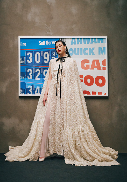 화이트 케이프 디테일 이브닝드레스 가격 미정 YCH. 화이트 펌프스 가격 미정 스튜어트 와이츠먼. 십자가 모티브 이어링 38만원, 주얼 장식 링 23만원 모두 타니 by 미네타니.