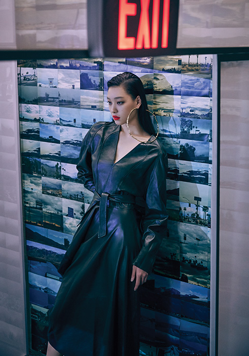 그린 컬러 레더 드레스 가격 미정 셀린느. 볼드한 골드 이어링 80만원 1064 STUDIO.