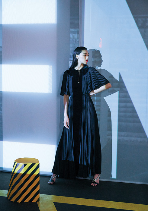 네이비 컬러 플리츠 드레스, 네크리스 모두 가격 미정 디올. 주얼 장식 스트랩 힐 2백10만원대 로저 비비에.