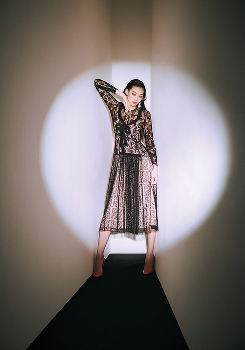 레이스 디테일 블랙 드레스 5백52만5천원, 핑크 컬러 펌프스 83만5천원 모두 보테가 베네타. 볼드한 화이트 이어링 11만8천원 젬마알루스. |