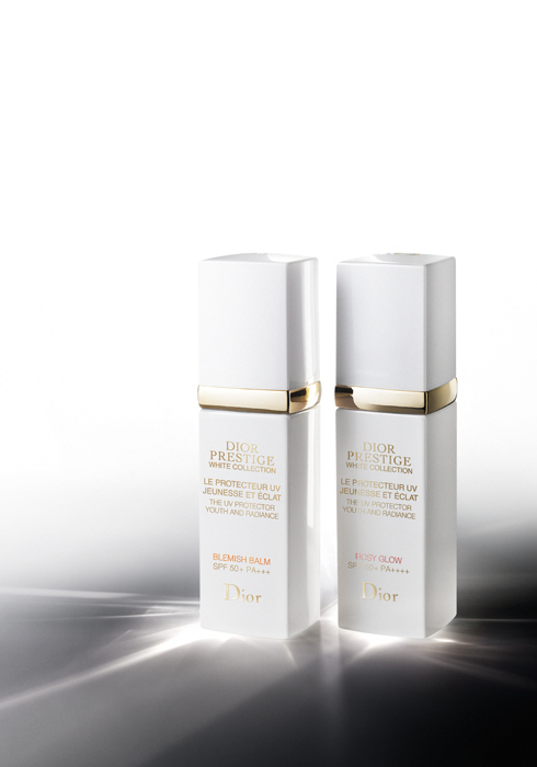 두 가지 텍스처로 선보이는 ‘디올 프레스티지 화이트 컬렉션 유쓰 앤 래디언스 UV 프로텍터’. 컬러 코렉팅 피그먼트를 함유해 다크 스폿, 균일하지 않은 피부 톤을 커버하는 크리미한 텍스처의 ‘블레미쉬 밤 SPF 50+ PA+++’과 가볍고 촉촉한 텍스처로 다이아몬드가 피부에 반사되듯 여러 각도에서도 화사하게 빛나는 피부 코팅 효과를 선사하는 ‘로지 글로우 SPF 50- PA+++’, 각 30ml 14만8천원.