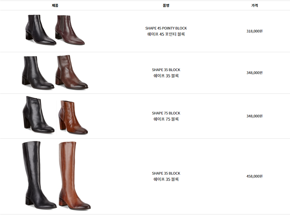 여기에 블록 형태의 안정감 있는 굽으로 착용감을 높였으며 발의 자연스러운 곡선을 따라 인체공학적으로 만들어진 풋베드와 쉥크(Shank, 지지대), 쿠셔닝이 뛰어난 경량의 PU 아웃솔로 완성시킨 ECCO(에코)만의 ‘SHAPE(쉐이프) 시스템’은 부츠를 신었을 때 발의 피로감을 최소화해준다. 또한, ‘SHAPE(쉐이프) 컬렉션은 35mm, 45mm, 75mm 높이의 다양한 굽과 디자인으로 구성되어 자신의 체형과 원하는 스타일에 맞게 선택의 폭을 넓혔다.