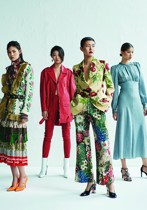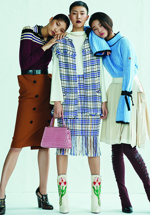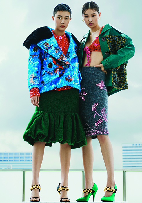 (왼쪽부터) 블루 패턴 재킷 5백40만원, 비즈 장식의 오렌지 컬러 카디건 가격 미정, 그린 펠트 스커트 1백70만원, 골드 주얼 장식 스트랩 슈즈 가격 미정 모두 프라다. 그린 레더 트위드 재킷 5백40만원, 니트 브라 톱 가격 미정, 비즈 플라워 장식의 펠트 스커트 가격 미정, 골드 주얼 장식 메리제인 슈즈 가격 미정 모두 프라다. 골드 이어링 35만원 잉크. |