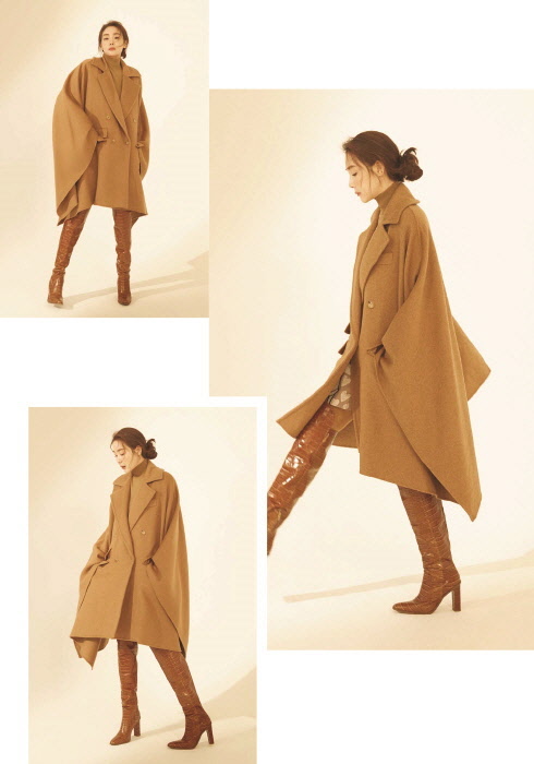 입체적인 실루엣의 캐멀 헤어 케이프 코트, 캐멀 컬러 울 터틀넥, 자연스러운 주름이 멋스러운 레더 부츠 모두 막스마라.