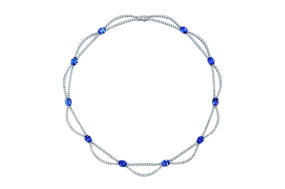 6 레이스처럼 이어진 울트라 브라이트 컷 다이아몬드 사이로 푸른색 탄자나이트를 세팅해 눈부시게 빛나는 몬테블루 네크리스. 눈 덮인 하얀 산과 푸른 하늘이 만들어낸 아름다운 풍경을 담았다.