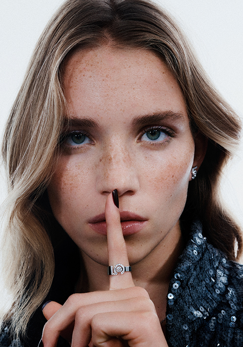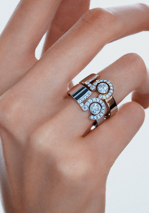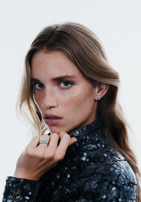 총 2.23캐럿의 72개 라운드 컷 다이아몬드를 세팅한 18K 화이트 골드 소재의 변형 가능한 ETERNAL N°5 이어링, 중앙에 0.25캐럿의 라운드 컷 다이아몬드를 세팅하고 숫자 5 전체를 총 0.20캐럿의 19개 라운드 컷 다이아몬드로 정교하게 세팅한 18K 화이트 골드 소재의 ETERNAL N°5 링. |