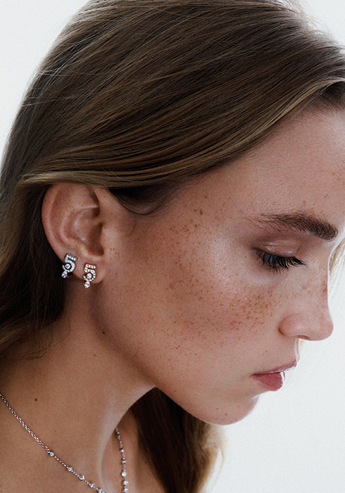 화려한 무드를 선사하는 로브를 길게 늘어뜨린 이어링으로 착용하거나 심플하게 이어 스터드 타입으로 연출 가능하며, 총 2.23캐럿의 72개 라운드 컷 다이아몬드를 세팅한 18K 화이트 골드 소재의 ETERNAL N°5 이어링. |