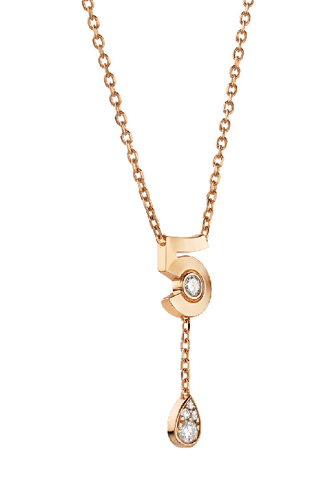 물방울 모양의 펜던트와 숫자 5의 우아한 하모니가 돋보이는 18K 베이지 골드 소재의 EXTRAIT DE N°5 네크리스. |