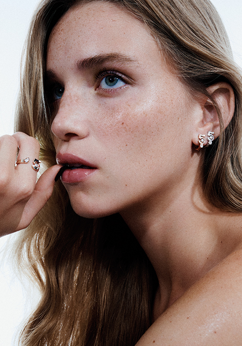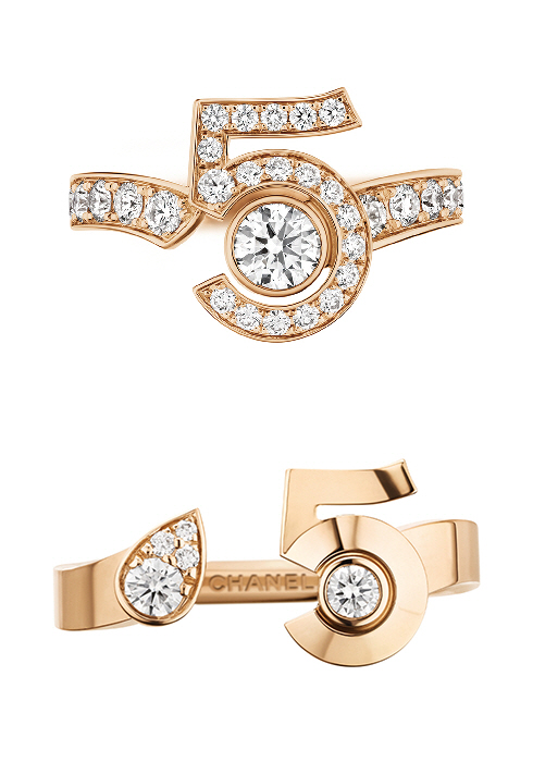0.18캐럿의 18개 라운드 컷 다이아몬드를 세팅한 18K 베이지 골드와 18K 화이트 골드 소재의 ETERNAL N°5 싱글 이어링, 총 0.15캐럿의 5개 라운드 컷 다이아몬드를 세팅해 우아한 볼륨감을 자랑하는 EXTRAIT DE N°5 링. |