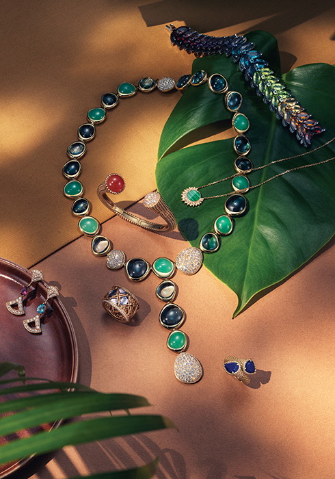 스티븐 웹스터 매그니피센트 페더 브레이슬릿 다채로운 컬러 스톤으로 빚어낸 대담한 볼륨감이 돋보이는 주얼리 피스. 화이트 골드 위 페리도트와 시트린, 블루 토파즈와 애미시스트, 로돌라이트와 레드 가닛, 그리고 블랙 다이아몬드로 강렬한 개성을 담았다. 6천만원대. 문의 02-2231-1592