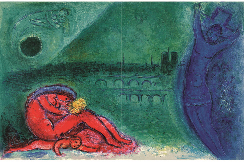 마르크 샤갈(1887~1985)은 앙드레 브르통이나 만 레이처럼 초현실주의 진영에서 활약하거나 간접적으로라도 세를 보탠 인물이 아니다. 작가 스스로도 특정 사조로 분류되는 걸 거부한 것으로 알려졌다. 그러나 꿈꾸는 듯한 세계를 표현하는 신비하고 환상적인 시각언어 덕분에 초현실주의적인 화가로 여겨지기도 한다. 현재 서울 삼성동 마이아트뮤지엄에서 진행 중인 <샤갈 특별전>은 동유럽 유대인 출신의 ‘경계인’으로서 작가의 면모를 다룬 전시라는 점에서 시선을 모은다. 물론 ‘Chagall and the Bible’이라는 부제만 보고 성서를 소재로 한 종교 전시처럼 생각할 수도 있다. 하지만 샤갈이라는 예술가의 삶과 작업에서 성서적 모티브와 신앙은 중추적이며, 단순히 종교화로 정의할 수 없다. 그가 노년기에 여생을 보낸 남프랑스에 있는 국립 샤갈 미술관을 좋은 예로 꼽을 수 있는데, 이 미술관은 ‘성서 미술관’이라고 불릴 정도로 구약성서 연작으로 채워져 있다. 러시아의 소도시 비테스크의 유대인 게토에서 태어나고 자란 샤갈에게 ‘신앙’은 아주 중요한 삶과 예술의 원천이었다. 당시 동유럽 유대인들은 도피적이고 금욕적인 거룩함을 추구하는 게 아니라 일상의 삶에 두 발을 단단히 붙인 채 현실의 기쁨을 누리는 ‘일상의 신성화’를 추구하는 하시디즘의 영향을 받았는데, 샤갈도 그러했다. 시인이기도 했던 샤갈은 성서야말로 가장 위대한 시의 원천이라고 생각했고, 구약에 담긴 많은 스토리에서 ‘인류애’를 끄집어냈다. 러시아혁명, 1, 2차 세계대전을 겪었고 자신이 가장 사랑했던 첫 부인을 잃고도 예술에 매진할 수 있었던 건 ‘열광적으로 타오르는 희망’이라는 하시디즘의 정수가 그의 기저에 자리했기 때문이기도 했을 것이다. 4m에 이르는 대형 태피스트리 작품을 비롯해 2백20여 점의 작품을 선보이는 이번 전시는 4월 10일까지.