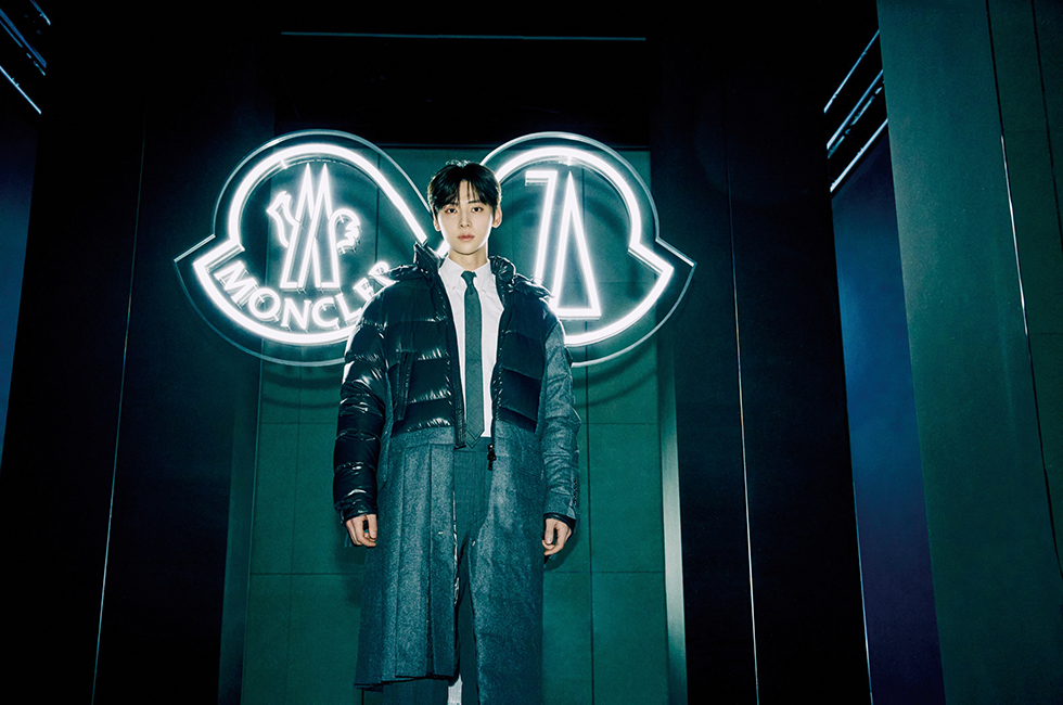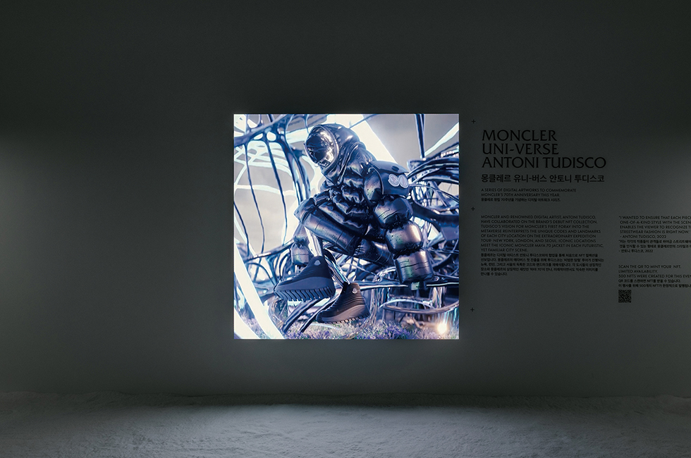 전시는 세 가지 주요 콘셉트로 구성되었는데, 첫 번째 공간은 ‘비범한 경험’이라는 주제로 산을 도심으로 가져와 몽클레르의 선구적인 역사를 보여준다. 공간 중앙에는 3D로 구현한 지형과 벽을 타고 이어지는 CGI 애니메이션, 브랜드 유산과 가치를 설명하는 몰입형 영상이 재생된다. 눈과 안개같이 오감을 자극하는 요소가 더해져 더욱 실감 나는 경험을 할 수 있었다. 두 번째 ‘비범한 순간들’에서는 7개의 투명한 아카이브 박스로 70년간 이어온 몽클레르의 브랜드 정체성을 규정하는 주요 이벤트를 보여준다. 이를테면 1952년 지금의 다운 재킷을 탄생시키는 데 영감을 준 몽클레르의 첫 번째 작품, 패딩 침낭, 1954년 탐험가가 K2 정상을 성공적으로 등산할 수 있도록 재킷, 1968년 동계 올림픽 때 우승한 프랑스 국가 대표 팀이 착용한 재킷, 1980년 밀라노 젊은이를 뜻하는 파니라니가 착용한 재킷, 2016년 톰 브라운 테일러링의 미학과 몽클레르의 기능성을 융합한 감므블루 라인과 스노보딩에 초점을 맞춘 몽클레르 그레노블까지. 마지막 세 번째 챕터는 ‘비범한 디자인’이다. 챕터 이름에서 알 수 있듯 리처드 퀸, 톰 브라운, 릭 오웬스, 피에르파올로 피치올리, 크레이그 그린, 팜 엔젤스 같은 걸출한 디자이너나 브랜드와 함께한 몽클레르의 패션 아카이브 중 가장 아이코닉한 아트피스를 만나볼 수 있었다. 이에 더해 디지털 아티스트 안토니 투디스코와 협업해 5백 명의 관람객에게 서울에서 영감받아 선보인 NFT를 선물로 증정했다. 해당 NFT는 로열티 티어에 소속되는 한정판 NFT로, 몽클레르 제품과 이벤트를 먼저 만나볼 수 있는 우선권도 함께 주어진다. 이번 전시 프리 오프닝 이벤트에는 몽클레르의 앰배서더 황민현과 이성경이 브랜드 탄생 70주년을 기념하는 의미에서 아이코닉한 마야 재킷을 7명의 디자이너가 재해석한 ‘몽클레르 마야 70 컬래버레이션’을 착용하고 참석했다.