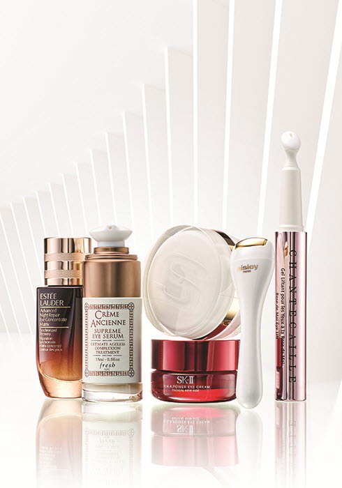 오직 눈가를 위한 갈색병, ‘에스티 로더 어드밴스드 나이트 리페어 컨센트레이트 매트릭스’를 소개한다. 시원하고 또렷한 눈매를 위한 갈색병 아이 에센스 크림으로, 풍부한 영양감이 느껴지는 특별한 텍스처가 특징이며, 잔주름과 굵은 주름, 다크서클, 부기 등 눈가에 나타나는 다양한 노화의 징후를 차단해 눈가는 물론 얼굴 전체의 생기를 되찾아준다(15ml 10만원대). 청정한 수도원에서 빚어낸, 눈가 피부에 생명력을 선사하는 ‘프레쉬 크렘 앙씨엔느 수프림 아이 세럼’은 작년 출시된 크렘 앙씨엔느 수프림 페이스 세럼과 동일한 성분으로 만든 프레쉬의 첫 번째 아이 세럼이다. 자귀나무 껍질 추출물과 열대 식물 성분의 귀한 재료를 정교하게 블렌딩해 눈가 피부를 탄력 있게 가꾸는 강력한 효과를 자랑한다(15ml 26만원대). ‘시슬리 시슬리아 랭테그랄 앙티아쥬 아이 앤 립 콘투어 크림’은 기존 시슬리아 아이 크림에 행동 노화까지 케어하는 혁신적인 기술력을 접목해 탄생시킨 제품이다. 섬세하고 연약한 눈가와 입가 피부를 위해 특별히 개발한 크림으로, 눈가의 주요 고민인 주름과 탄력 저하, 부기, 다크서클뿐 아니라 입 주변의 건조함과 주름을 완화해준다. 세안 후 크림을 바르기 전, 함께 제공되는 마사지 툴을 이용해 눈가와 입가에 마사지를 해주면 제품의 흡수력을 돕고 눈가와 입가의 탄력을 살려준다(15ml 22만원). 연약하고 민감한 눈가를 관리하는 새로운 아이 케어 제품 ‘샹테카이 로즈 드 메이 아이 리프트’는 로즈를 베이스로 페르시안 자귀나무 추출물과 국화 추출물 등 89.4%가 천연 성분으로 구성되었다. 젤 크림 텍스처로 눈가에 바르면 강력한 보습 효과와 함께 활성 성분이 빠르게 피부에 흡수되어 즉각적인 리프팅 효과를 느낄 수 있을 것(8ml 13만9천원). ‘SK-II R.N.A 파워 아이 크림’은 피부 본래의 리듬을 되돌려주는 농축 피테라 에센스로 완성해 모든 각도에서 빈틈없이 촘촘하게 차오르는 눈가 탄력을 선사해준다(15g 13만원대).