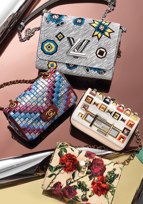 Shine jewel (위부터 차례대로) 키치한 매력의 와펜 장식 트위스트 백. 23X17cm, 4백80만원대 루이 비통. 모자이크 패턴에서 영감받은 아이코닉 백. 20X12cm, 가격 미정 샤넬. 스터드 장식이 앙증맞은 미니 트레바게트 백. 18X12cm, 3백만원대 펜디. 잠금 장식과 섬세한 장미 프린트가 특징인 미니 백. 20X14cm, 3백9만원 돌체앤가바나. Modern Classic