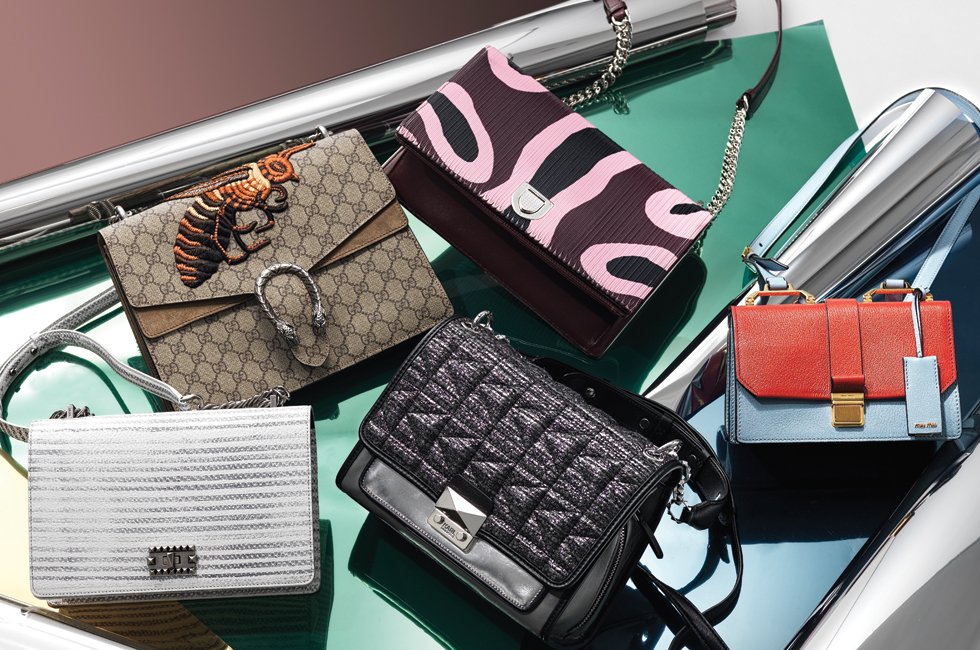 바랜 듯한 화이트 컬러의 레이디버그 그래비티 백. 25.5X17cm, 68만5천원 덱케. 로고 프린트와 벌 자수 장식이 들어간 디오니서스 백. 30X23cm, 4백66만원 구찌. 기하학적인 프린트로 장식한 카프 스킨 디올라마 백. 29.5X19cm, 4백70만원대 디올. 경쾌한 컬러 배색이 사랑스러운 마드라스 백. 21X14cm, 1백60만원대 미우미우. 양가죽 소재의 퀼팅 트위드 백. 26X20cm, 76만원 칼 라거펠트.